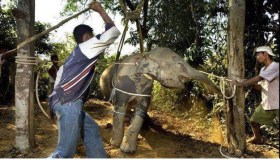 Capturing elephants from the wild often involves the slaughter of mothers and other protective family members with automatic weapons. Captured calves are then often subjected to a brutal ‘breaking-in’ process where they are tied up, confined, starved, beaten and tortured in order to ‘break their spirits’. It is estimated that only one in three survive this inhumane ‘domestication’ process.